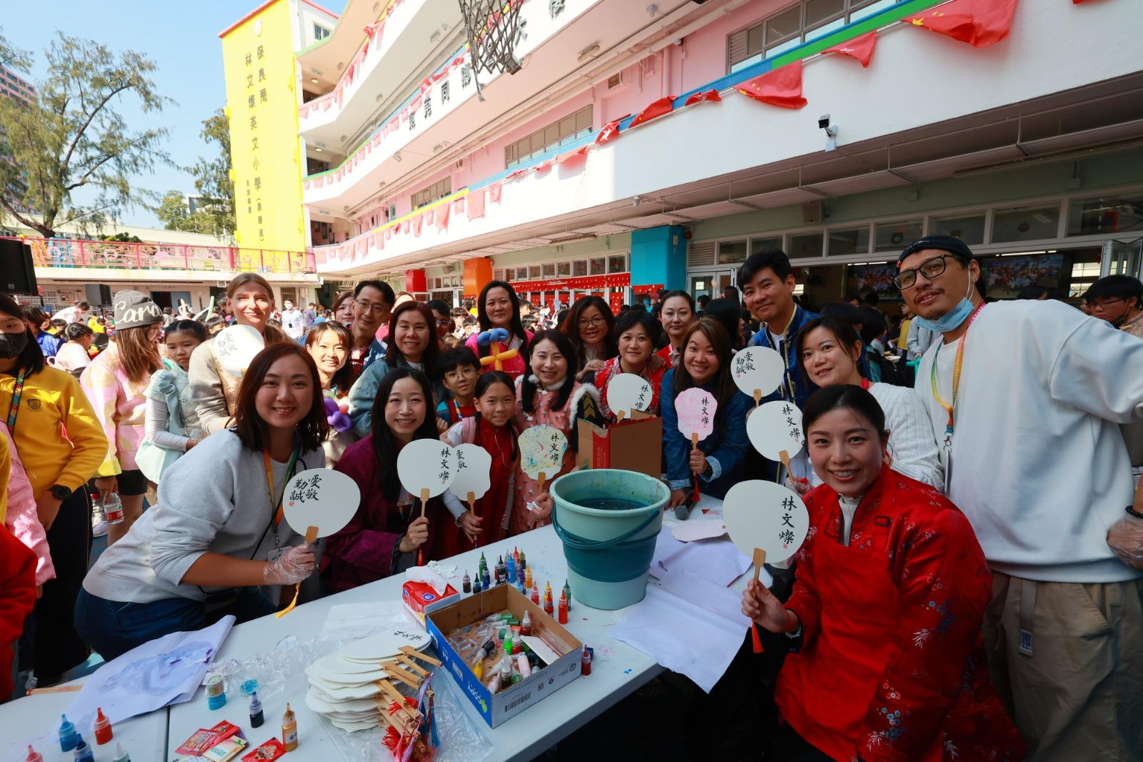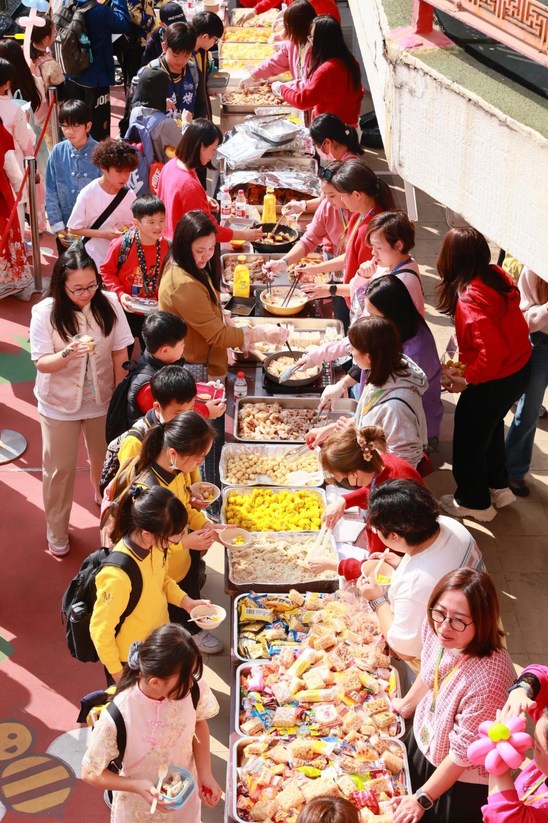 表演結束後,攤位遊戲隨即展開!師生們一同享用香煎蘿蔔糕、芋頭糕及各式糖果水果🍇🍊🫐 面部彩繪、Henna手繪、扭氣球、寫揮春、小遊戲應有盡有,今年更增設漆扇製作、即影即有與棉花糖攤位,氣氛熱烈歡騰。